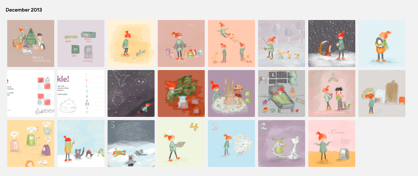 Seven years ago I was working on a daily advent calendar for Ruby. I had just moved back to Helsinki from New York and was looking for momentum, some kind of permission to start working on the children’s book I had been talking about. My drawing sucked and the stories limp.