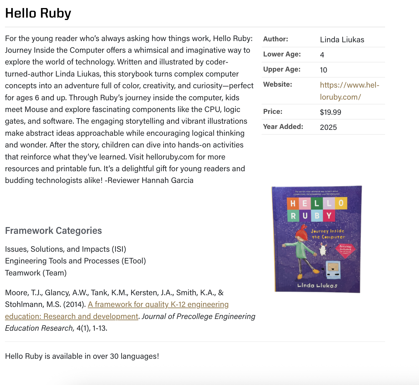 It makes me so happy a book that is well over a decade gets this glowing recommendation. “For the young reader who’s always asking how things work, Hello Ruby: Journey Inside the Computer offers a whimsical and imaginative way to explore the world of technology”. Each year Purdue University reviews dozens of toys and kits, evaluating each for educational value, engagement and accessibility. The final list includes gifts that support hands-on learning, creativity and critical thinking. The other nine finalists look great too for a budding engineer!