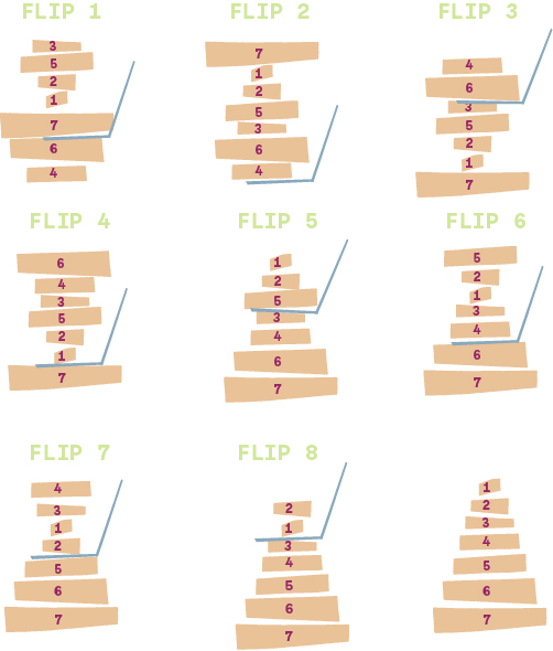 This is an algorithm to sort a disordered stack of pancakes in order of size in the smallest number of steps. There’s a lot of varieties to both the problem and the solution, but in essence what we shot was bringing always the largest pancake not yet sorted to the top with one flip and taking it down to its final position with one more flip. And then repeating this process for the remaining pancakes.