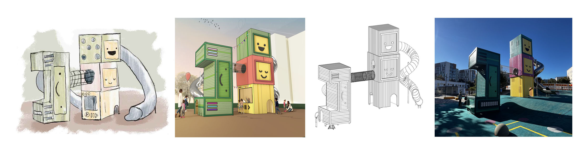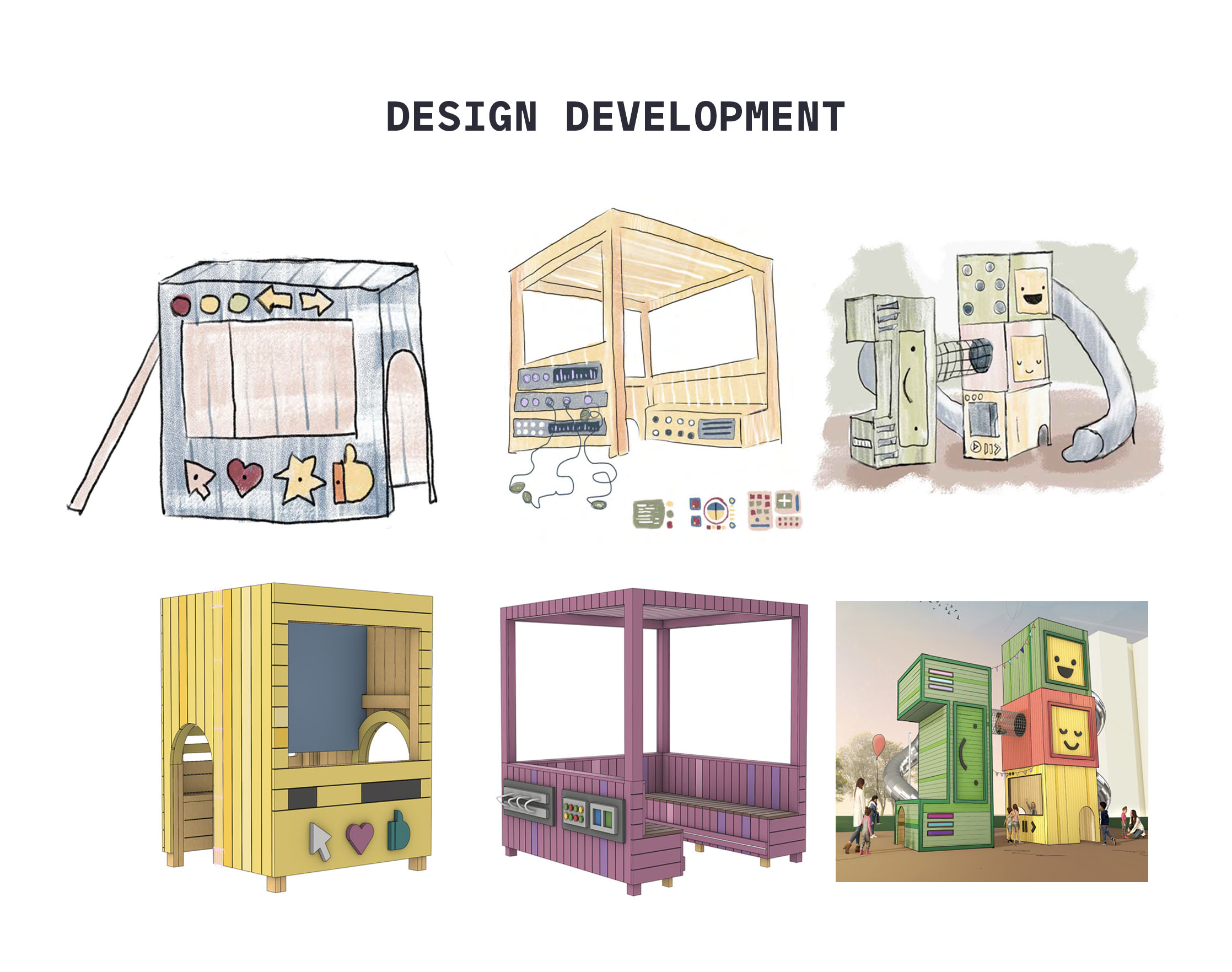 Open-Ended Interaction: Each play structure allows for multiple ways of engagement. These spaces aren't designed for a single, linear experience. For example, a computer tower made of abstract boxes or a sandbox shaped like a game controller can become anything children imagine.