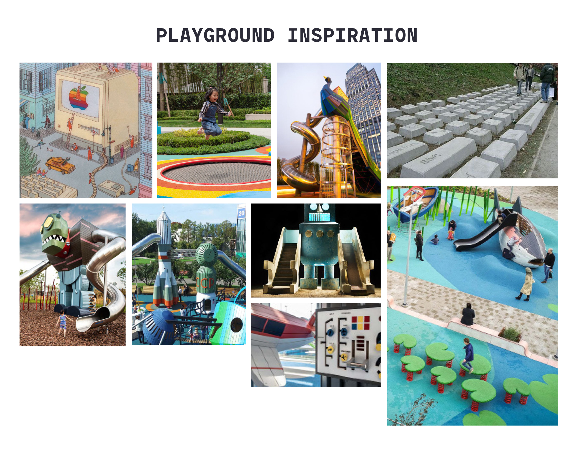 Playgrounds are both public and hidden spaces. My research began with understanding playground design, aesthetics, and the broader built environment. Placing this project within the wider landscape of standardized playgrounds, adventure playgrounds, and other play structures helped me build a vocabulary and frame the vision. Artists like Carsten Höller, Yinka Ilori, Florentijn Hofman and Toshiko Horiuchi MacAdam have also influenced my thinking with their artistic approaches to playgrounds.