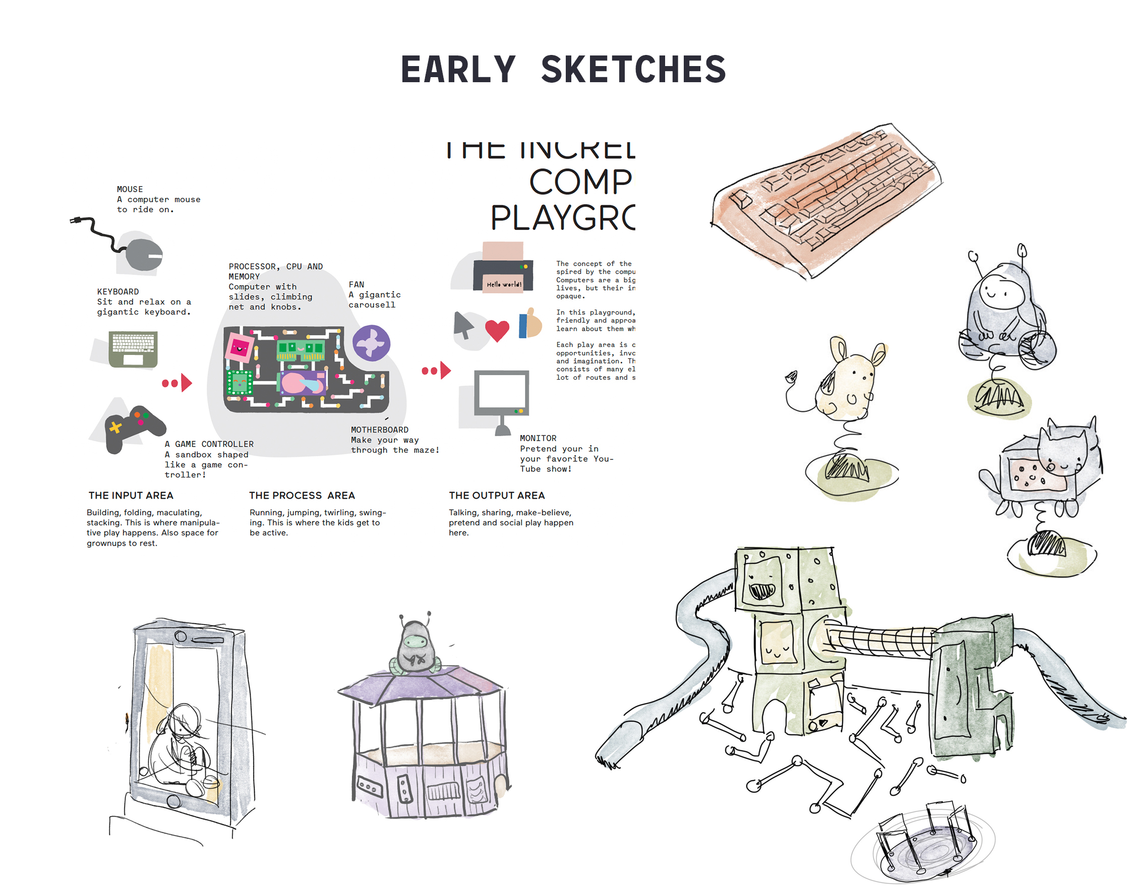 The first concept sketches for this playground are from the fall of 2020. These early drawings outlined a rough structure, dividing the space into areas for input, processing, and output—echoing the flow of computation.