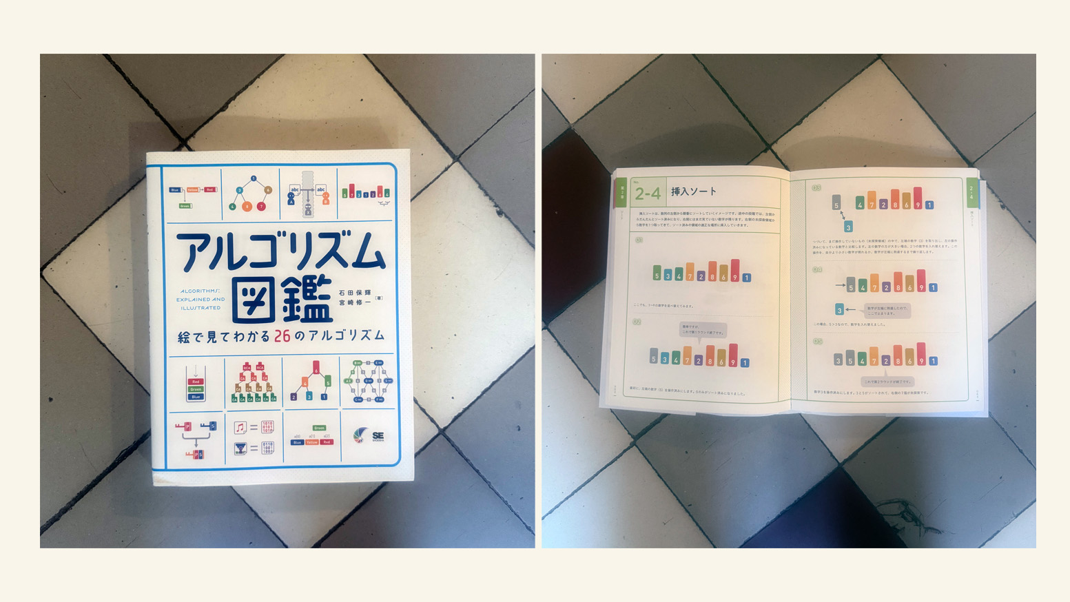 Another ingredient is a book I found while moving. I got アルゴリズム図鑑 by Yoshiki Ishida and Shuichi Miyazaki from my Japanese publisher almost ten years ago. It’s a visual guide to twenty-six different algorithms, designed in a clear, step-by-step manner reminiscent of IKEA instructions.