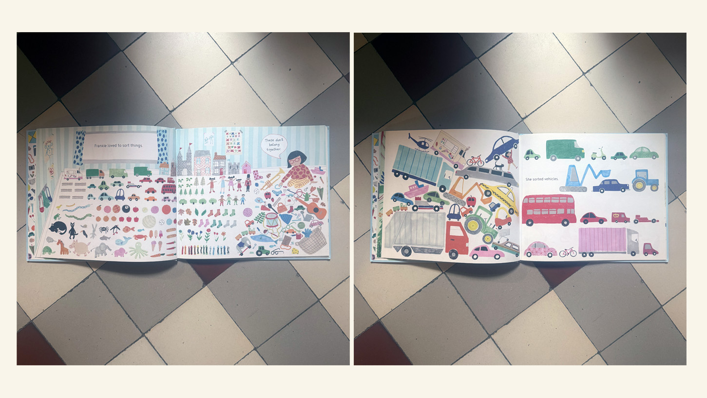 There’s a book we read almost every week called All Sorts by Pippa Goodhart. It’s beautifully illustrated and full of the sensory detail of the world - plants and toys and cars and people. It’s about a little girl named Frankie who loves to sort things in every way imaginable. The vehicles spread is a favorite in our house.