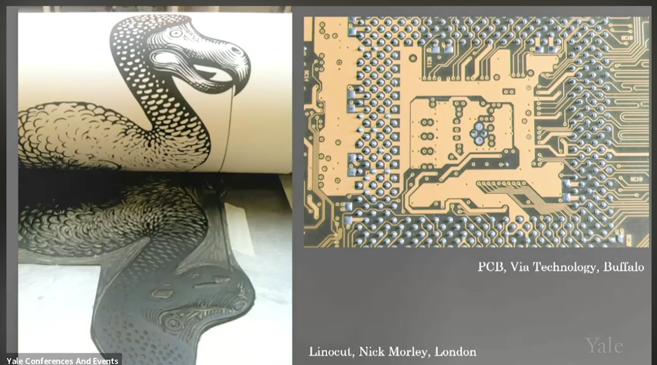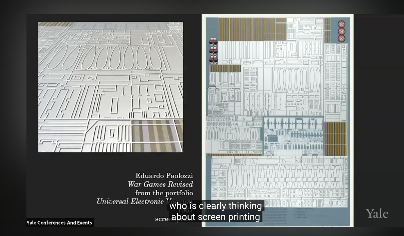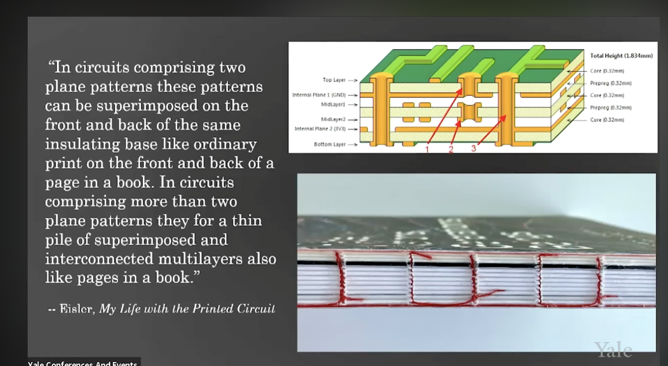 The talk is over an hour long and maps the connections between printmaking and electronics, book-binding and PCBs, ornaments and Paolozzi. I love research that recenters history and introduces new cast members. In this case, Paul Eisler, the forgotten person behind printed circuit boards. The talk also includes a bit on twistronics and moiré pattern (achingly good!), screen printing and armory, Durer and engraving, lithography and Babbage..